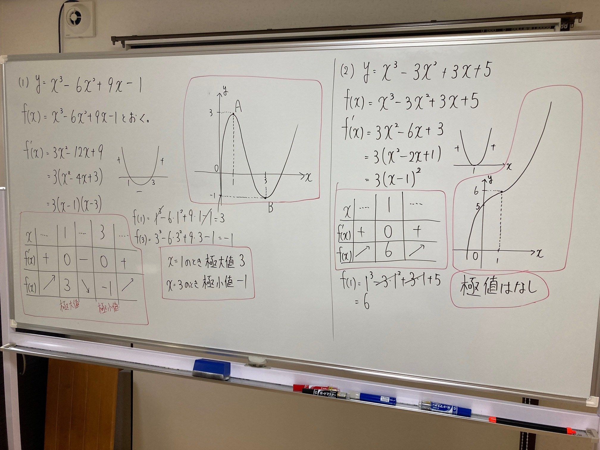 1月10日(土)の数Ⅱは「微分」を扱いました。増減表→グラフ→極値の確認など、少し忙しい感じがしますが、ひとつひとつ丁寧に行っていきましょう。